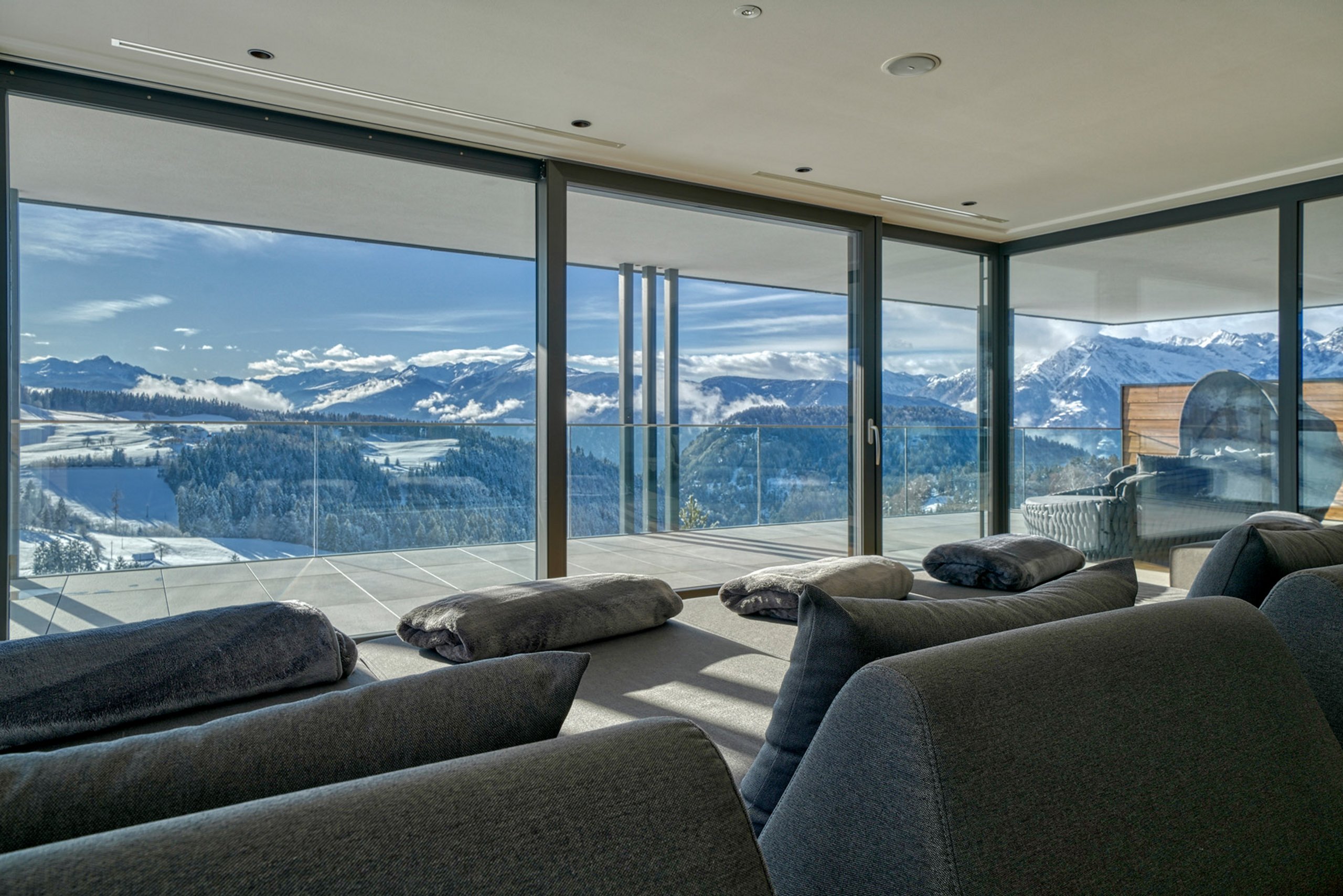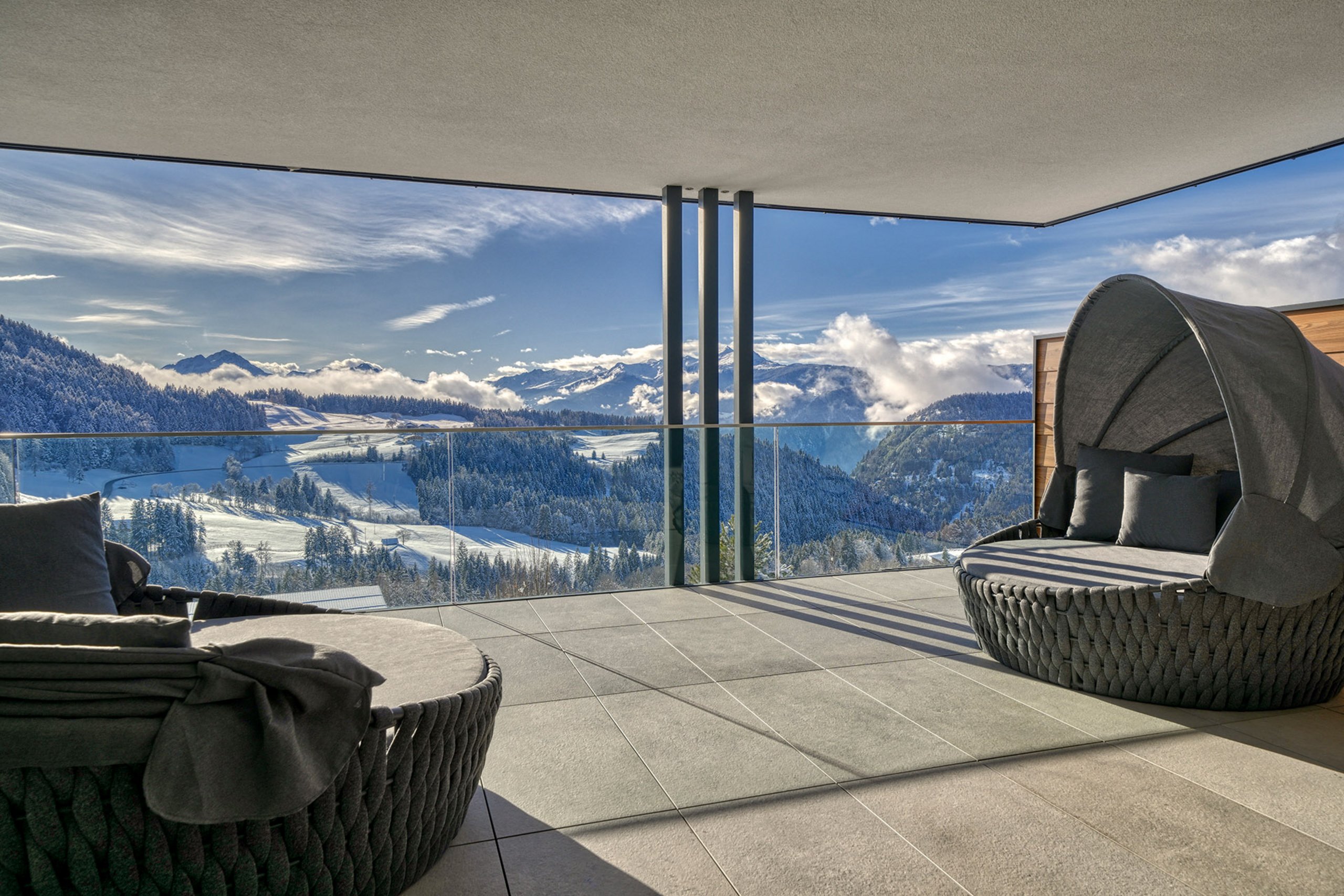Der große Südbalkon mit 12 Quadratmetern und einer herrlichen Aussicht ist nur eines der Highlights der Suite Allium. Entdeckt euer neues Urlaubszuhause! In dieser Suite nehmen wir keine Haustiere auf.